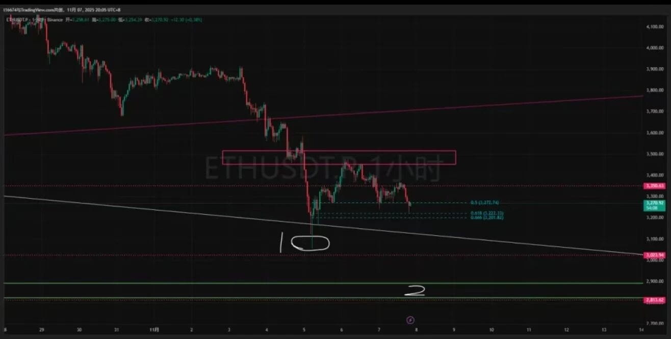 Ethereum is very weak, having quickly dropped after being blocked at the upper resistance area. It is currently testing the Fibonacci 0.618 level and beginning to slowly retrace. However, I do not hold much hope for ETH unless BTC quickly recovers above and breaks down again; otherwise, I believe ETH will continue to drop to previous lows, even down to the next key support at 2,800.