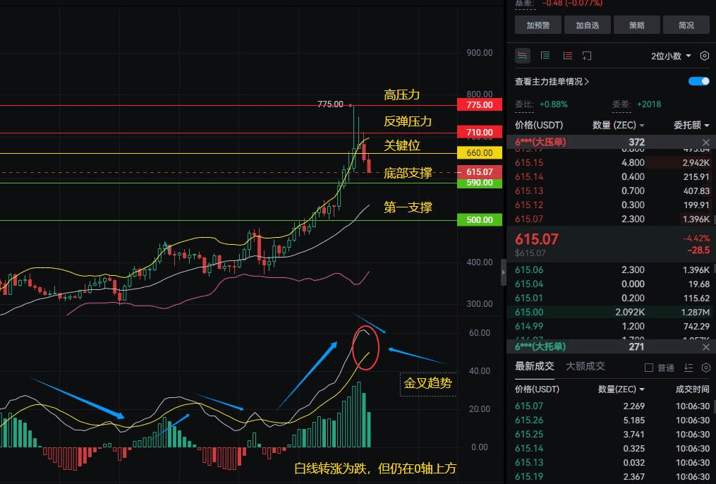 Looking at the one-hour K-line chart, the current price is 615.07. Although the MACD white line has turned down, it is still above the zero axis; the golden cross trend has not broken, which is a typical 'continuation signal' for an upward trend. There may be a short-term pullback, but the overall direction has not turned bearish.