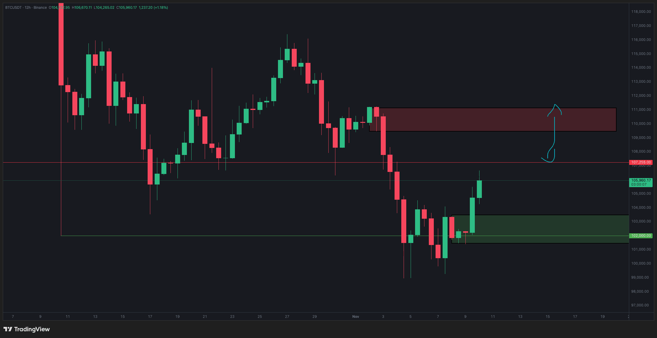 $107k is the key zone that i think price needs to reclaim. its the low that was holding the price before, Bears were failing to give a weekly close below $107k and now that last week closed below $107k this area will be a hurdle now.