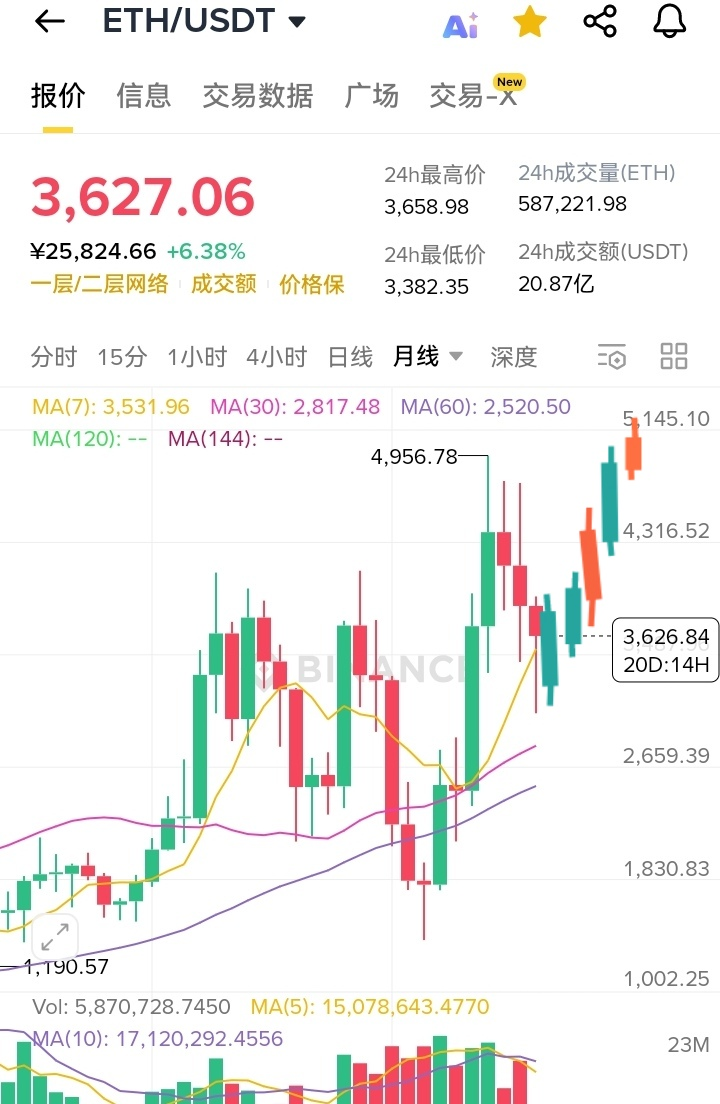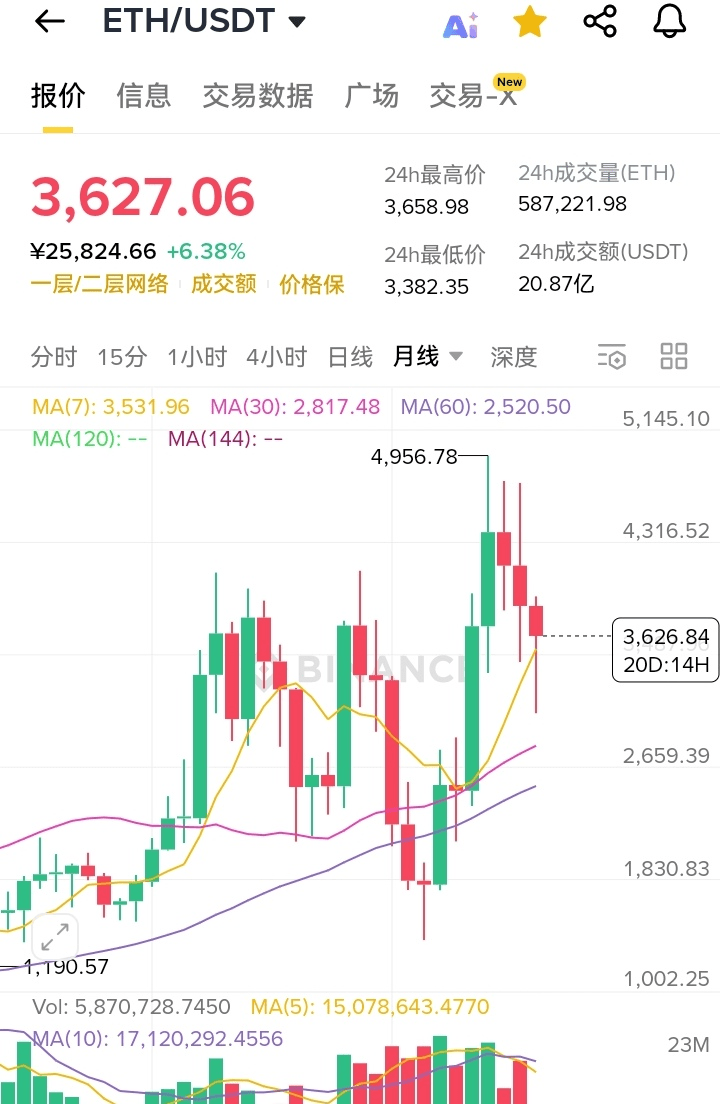 Let's take a look at the combat map. ETH's current market has already retraced to the monthly line support above 3500. The monthly line is a large bearish line, and there is a bearish pressure. Currently, the point above 3500 is 3626 USD. Since it is under bearish pressure, above the support level, long positions must exit; once the long positions exit, the next step is to rest!