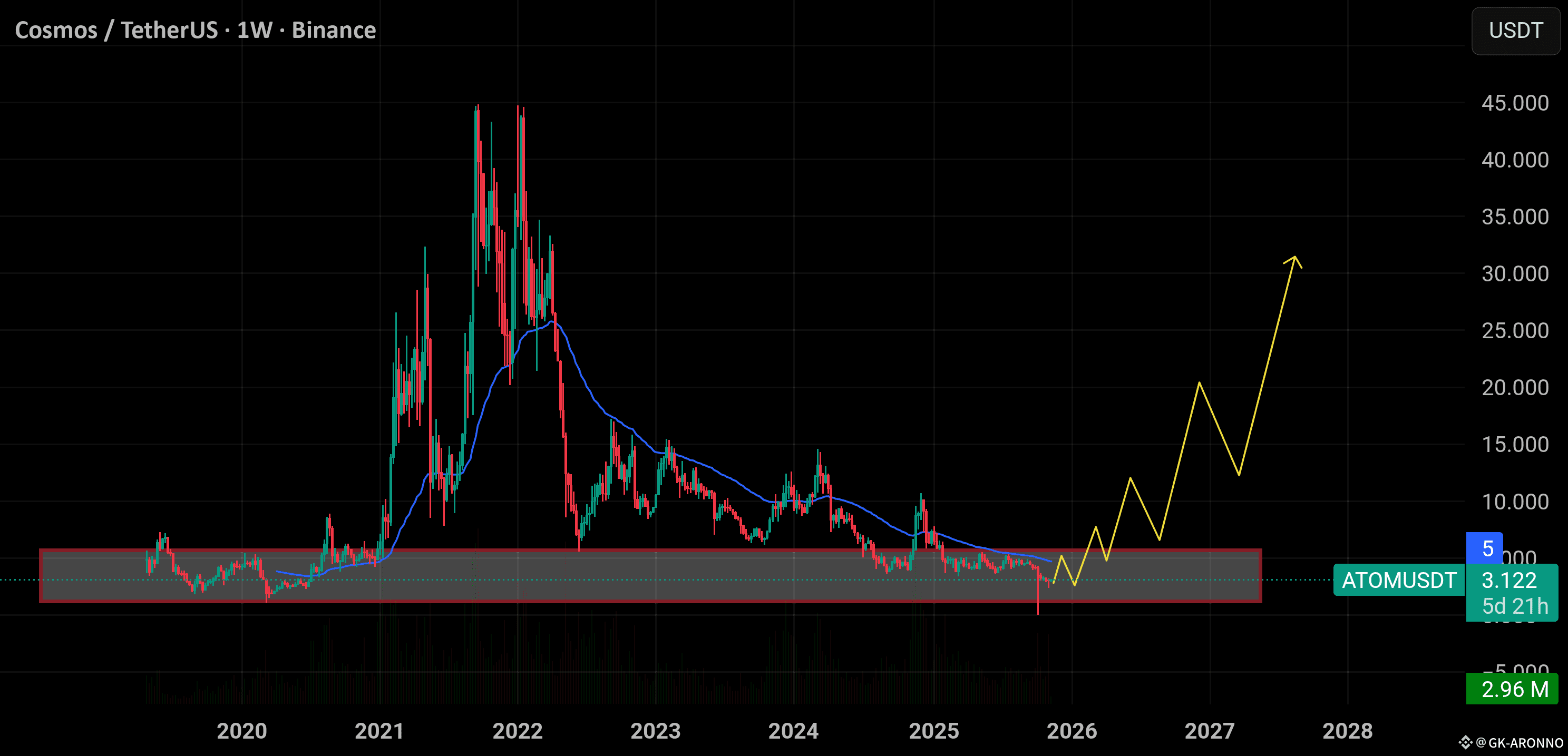 Cosmos has finally reached its long-term accumulation zone the same area that triggered explosive rallies in the past. As long as the price holds above the $2.5–$3.0 support region, this zone represents a major bottom formation.
