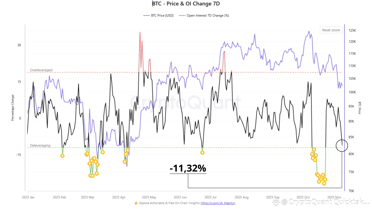 The 11.32% drop in Open Interest Change (OI) over 7 days indicates that the derivatives market is undergoing significant deleveraging, approaching the 12% threshold which, according to the presented metric, signals a strong buying opportunity. This movement represents a purge of excessive and speculative leverage, an event historically seen as a necessary “reset” for the structural health of the market. Deleveraging occurs when traders close leveraged positions (both long and short), reducing systemic risk and limiting the potential for further declines.