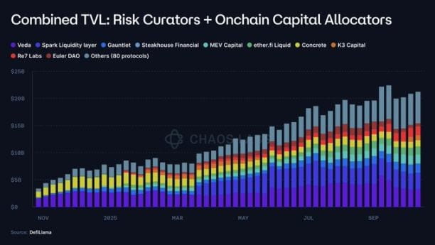 OCCA typically launches branded strategy products, while risk managers often utilize modular money markets (such as Morpho and Euler) to provide yield through parameterized vaults. The total locked value of these two types of products has surged from less than $2 million in 2023 to $20 billion, an increase of about ten thousand times.