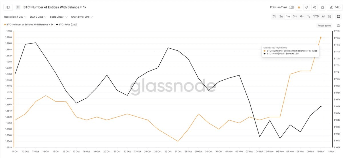 Reinforcing the recovery thesis, whale wallet data indicates an increase in accumulation. The number of entities holding over 1,000 btc rose from 1,362 to 1,388 between November 6th and 10th, a rise of about 1.9%.