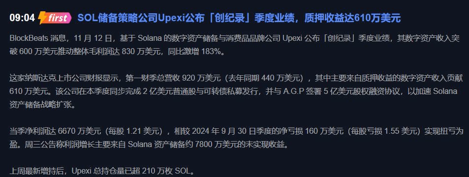 This is a positive news item. Upexi, a Nasdaq-listed company based on Solana, has reported record quarterly performance, with digital asset revenue exceeding $6 million and staking income reaching $6.1 million, marking a 183% year-on-year increase in gross profit. The company has also completed financing, with total holdings exceeding 2.1 million SOL. This news should theoretically be good for the price of SOL as it indicates real demand growth in the Solana ecosystem and increased institutional participation.
