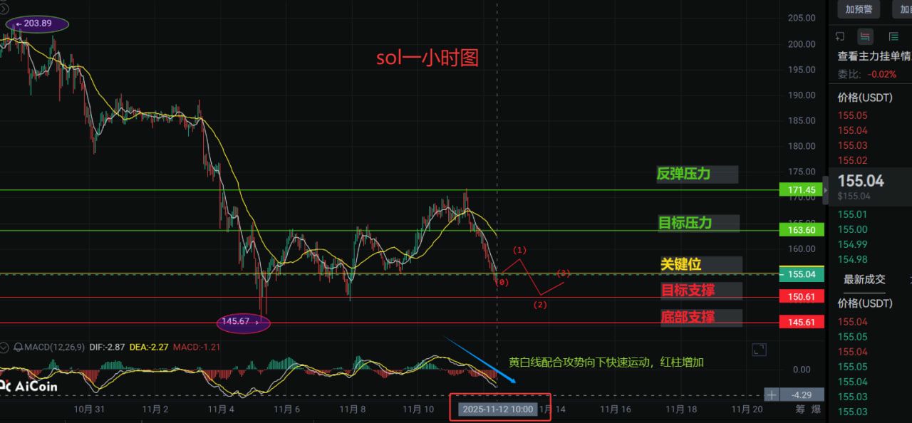 SOL has pulled back from the $200 high point at the end of October and is now stuck at the key level of $155. From a technical perspective, the MACD has a death cross, and red bars are increasing, clearly indicating strong bearishness; RSI is nearing the oversold zone, suggesting selling pressure is close to its end. Volume is shrinking, like a fight losing strength, and a shift in trend may occur shortly. In the past week, whales have made large transfers; some are running away while others are catching on. This decline is meant to wash out the weak hands.