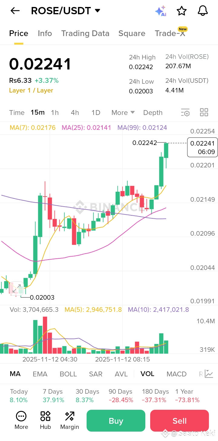 ROSE, the native token of the Oasis Network, suddenly lit up the charts after days of calm trading. The coin broke past its tight consolidation zone, fueled by a surge in buyer demand and volume — signaling that accumulation might be turning into full-on bullish action.