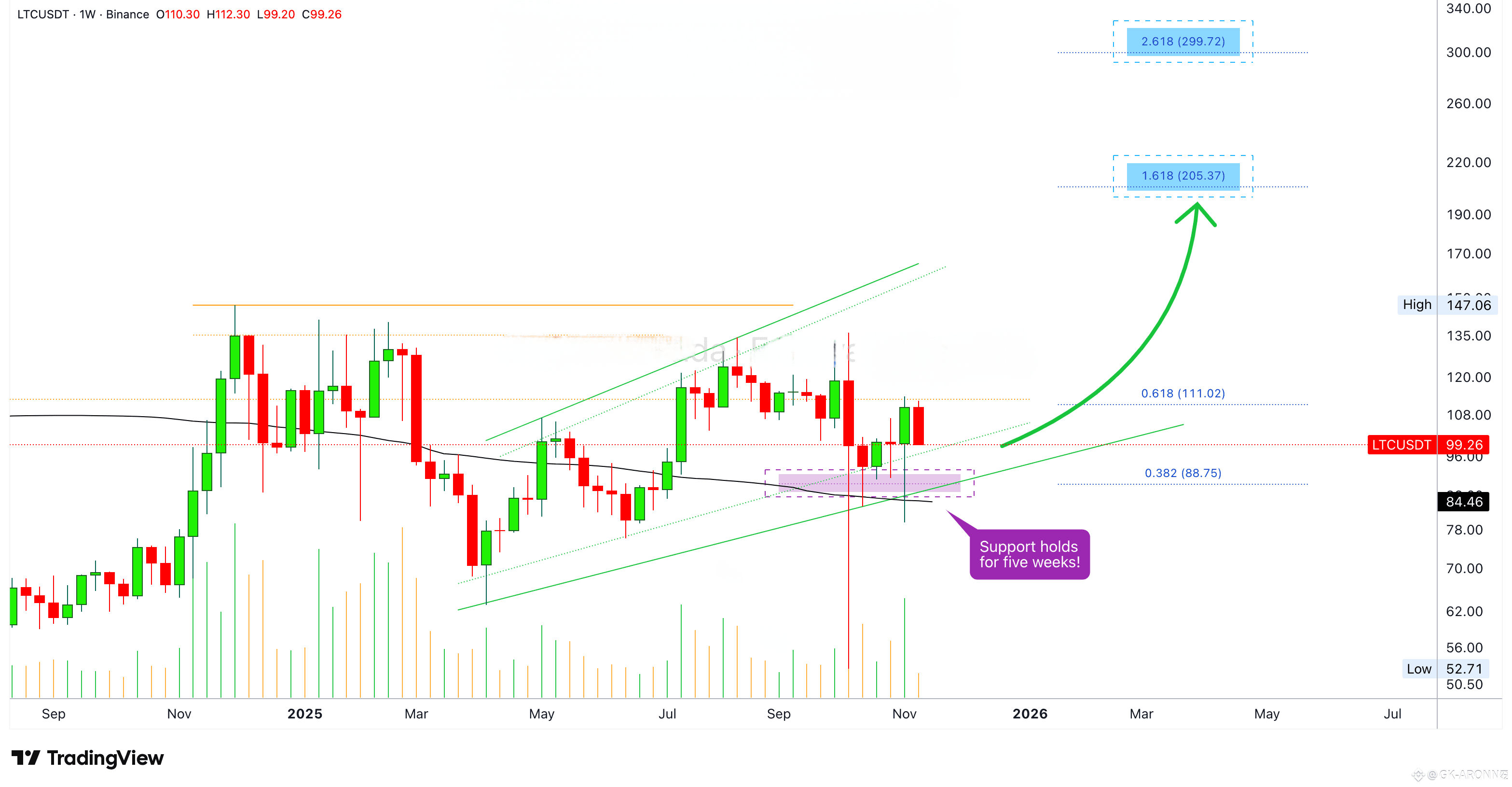 Here we can see Litecoin safely trading above support. Both, the support level mentioned in a previous update at $88, and the most important long-term indicator weekly MA200.