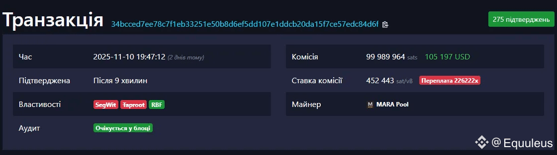 Інцидент став помітним після того, як його виявили учасники Crypto Twitter і підтвердив сервіс Mempool. Згідно з даними блокчейну, користувач надіслав лише 0,00010036 BTC, проте система зафіксувала комісію майже в 1 BTC - понад $105 000 за поточним курсом.