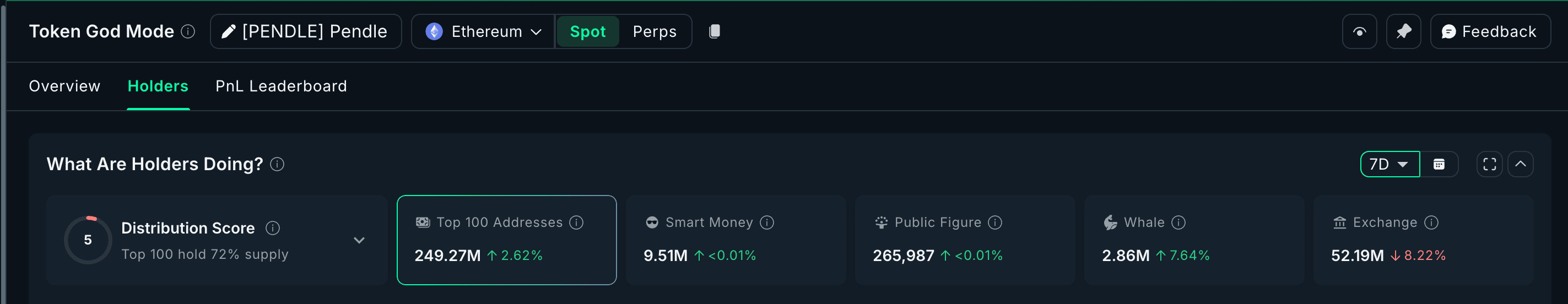 Whale wallets holding between 100,000 and 1 million PENDLE increased their balances by 7.64%, reaching 2.86 million tokens. At the same time, the top 100 addresses (large whales) have increased their holdings by 2.62%, now totaling 249.27 million tokens — an increase of about 6.37 million PENDLE, valued at nearly $17.7 million.