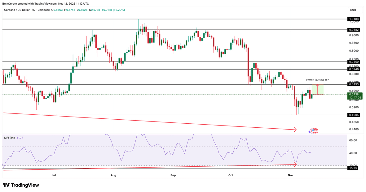 The technical chart has added weight to this movement. ADA has decreased by 41% over the past three months. However, between June 5 and November 4, the price recorded lower lows while momentum indicators formed higher lows. This is a classic bullish divergence pattern that often precedes a trend reversal.