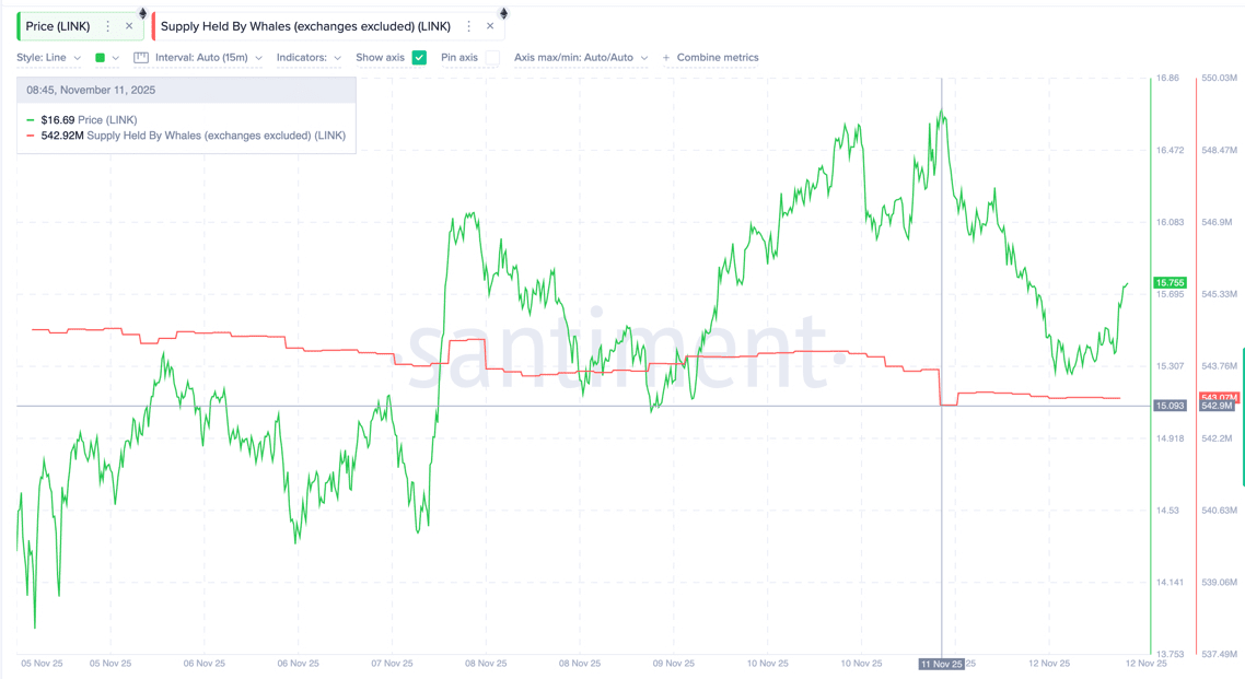 Cryptocurrency whales are buying Chainlink again after weeks of continuous selling. Over the past twenty-four hours, whale holdings increased from 542.92 million LINK to 543.07 million LINK. That's about 150,000 LINK, worth around $2.36 million at the current market price.