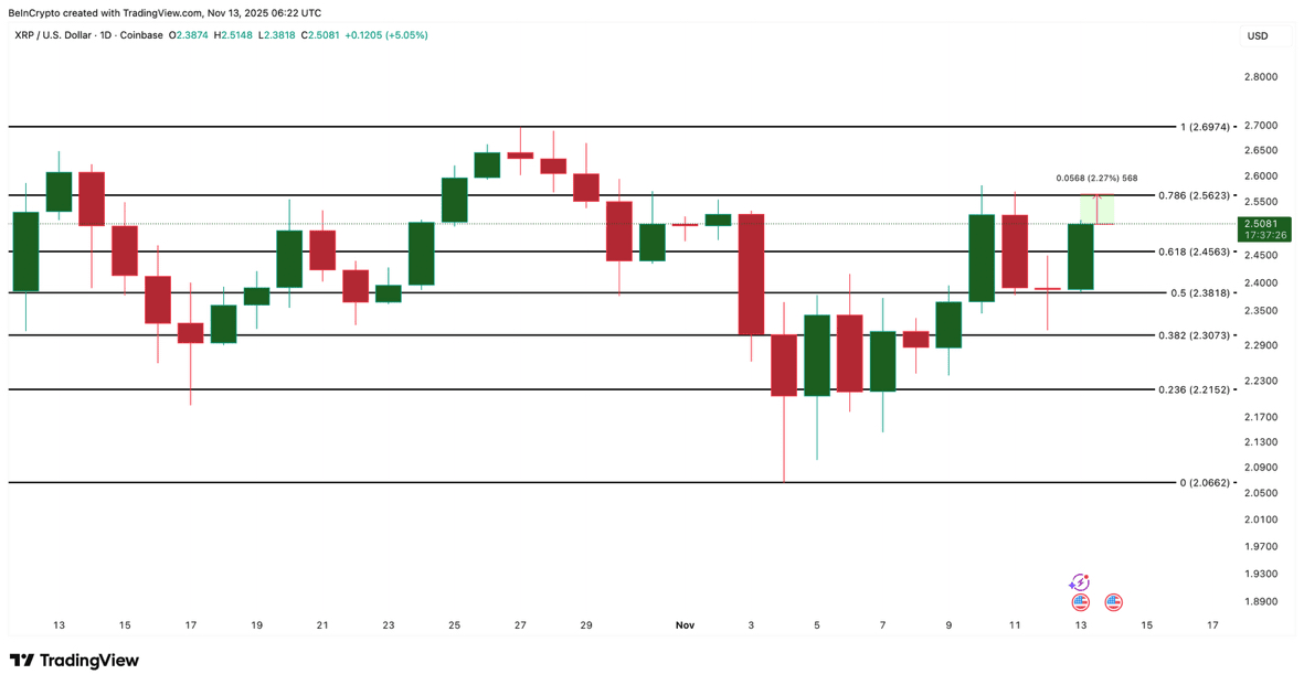 A large resistance wall at $2.52–$2.54 controls the breakout, and XRP needs a clean daily close above $2.56 to flip the short-term structure to bullish.