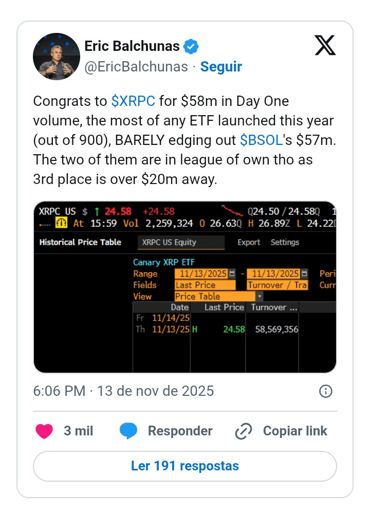 The XRP spot ETF (XRPC), launched by Canary Capital, began trading on Thursday (13) with around $58 million (approximately R$ 300 million) on its first day. This performance marked the most significant opening among all exchange-listed funds this year, even amid the declining cryptocurrency market.