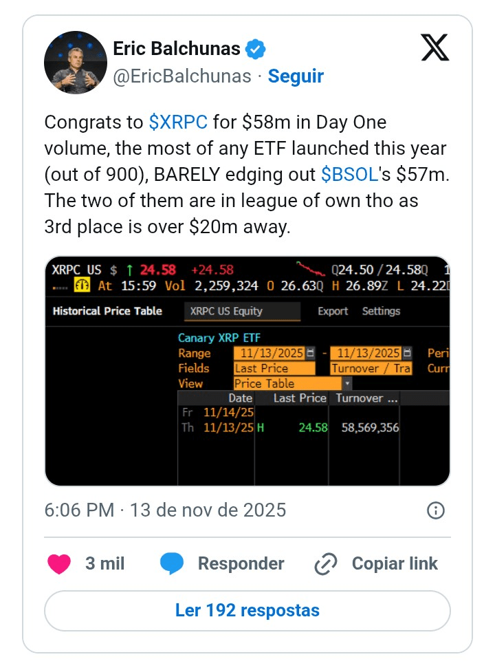 The intensity of the investments drew attention, as Bloomberg's ETF analyst, Eric Balchunas, had initially estimated something around $17 million for XRPC. However, the fund surpassed this amount in just 30 minutes and even managed to slightly outperform the Bitwise Solana Staking ETF (BSOL), which was launched two weeks ago with $57 million.