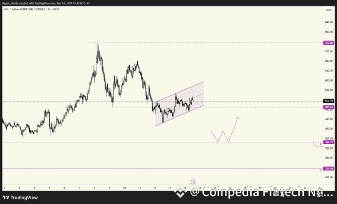 The Zcash price chart suggests a corrective pullback may form, potentially revisiting levels near $344–$350, where liquidity and renewed demand could re-emerge.