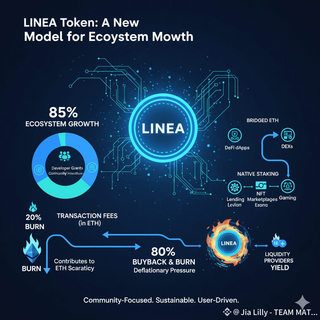 This design choice reinforces Linea's strong alignment with Ethereum's economy. The primary role of the LINEA token is to foster a vibrant and sustainable ecosystem by rewarding users, developers, and liquidity providers.A staggering 85% of the total LINEA token supply is allocated to ecosystem growth.