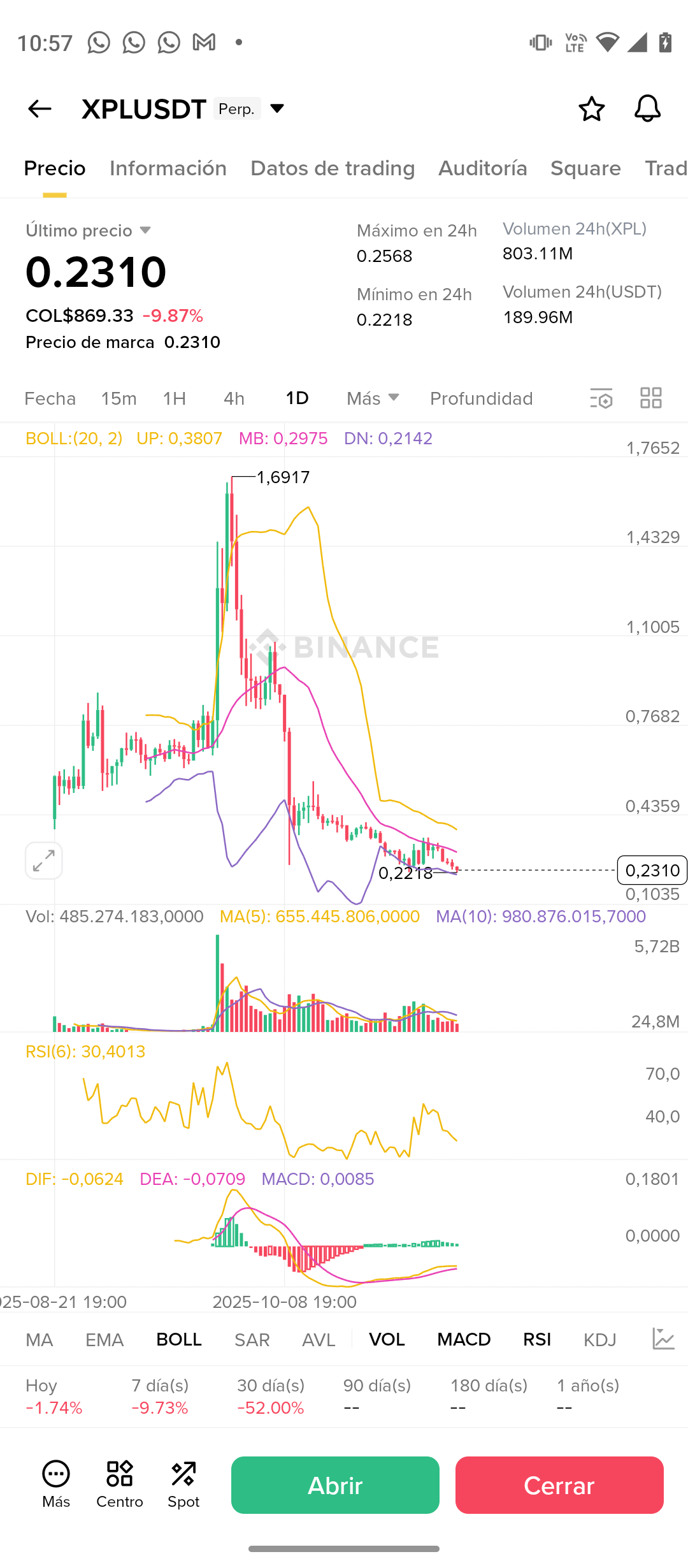 In the short term, the immediate resistance is at 0.26 – 0.28, where the candle structure shows previous reaction. Overcoming that range with a solid candle would pave the way towards 0.32 – 0.36, a level that coincides with the Bollinger base mean and the nearest liquidity zone. If the asset manages to close above 0.36, the projection expands towards 0.42 – 0.50 in a range of weeks.