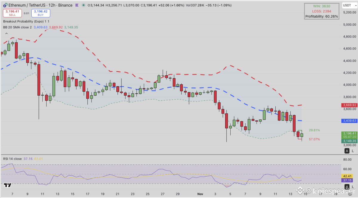 Ethereum trades around $3,183, on-course for a third consecutive losing session. The 12-hour chart shows ETH attempting to stabilize after a steady decline from the late-October highs, with candles now pressing against the lower Bollinger Band at $3,146.