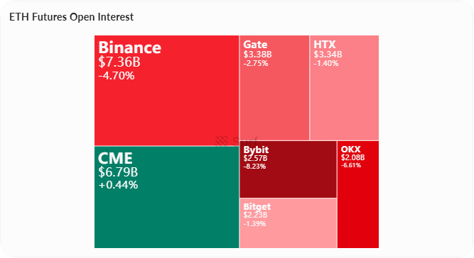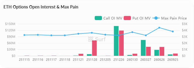 Total Options Open Interest $11.44B, down 3.82% in 24 hours. Recently, the largest pain point is at $3,200-3,250, creating a magnetic effect on price.