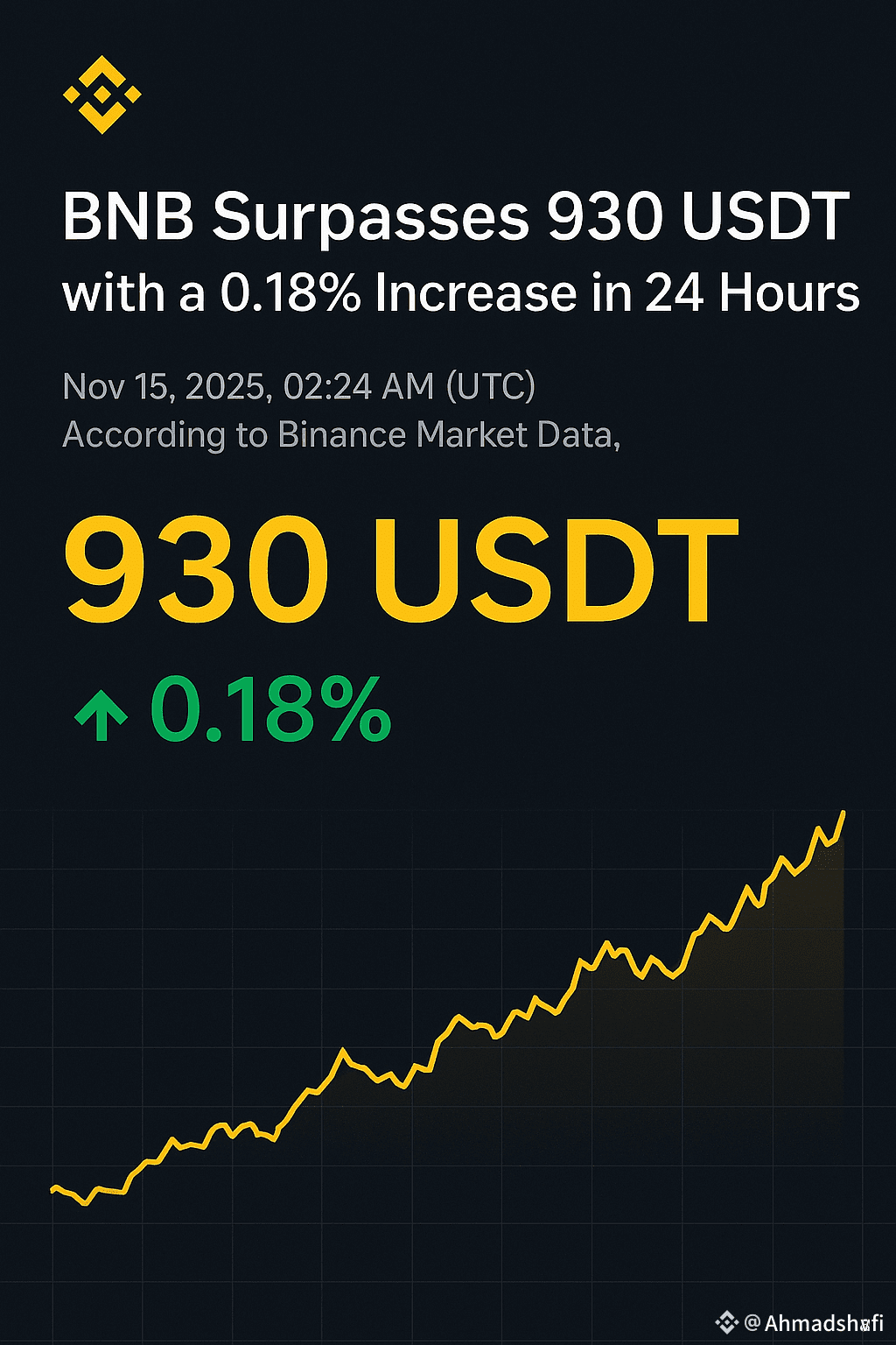 As of Nov 15, 2025, 02:24 AM (UTC), Binance Market Data shows that $BNB has officially crossed the 930 USDT milestone. The asset is currently trading at 930 USDT, reflecting a modest but steady 0.18% increase over the past 24 hours.