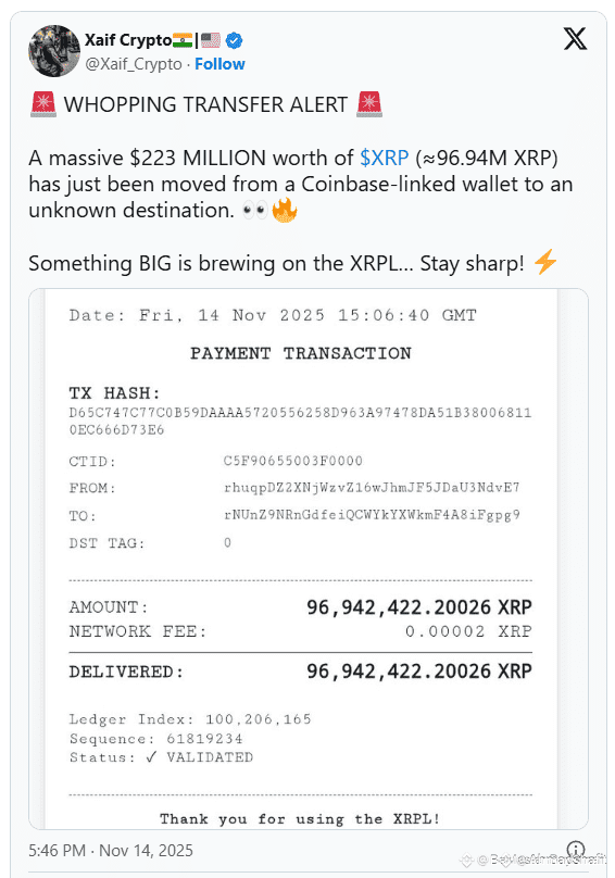 The $XRP Ledger just witnessed a seismic shift that has the entire community talking. A jaw-dropping transfer of over 96 million XRP (valued at ~$221M) has just left a wallet linked to Coinbase, heading into the unknown.