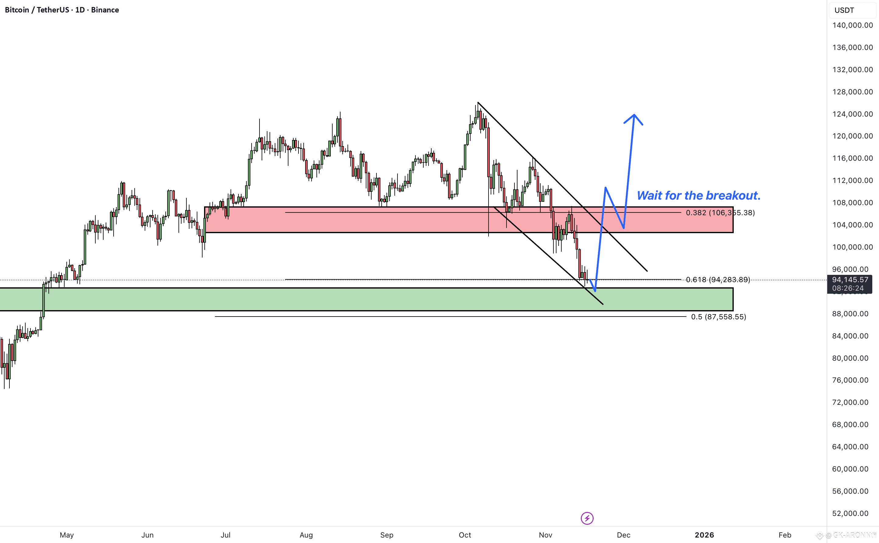 Bitcoin has dropped into the marked support zone, where a bullish reaction is likely in the short term. From this area, price may attempt a move back toward the descending trendline.