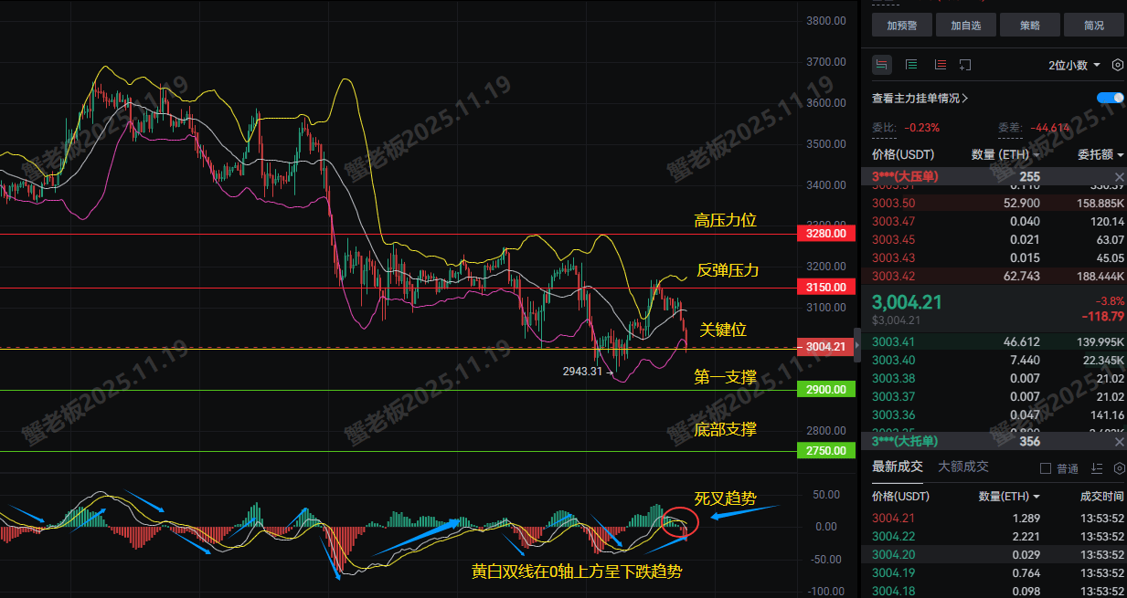 Hello everyone, Mr. Crab is back! Currently, the MACD of ETH has formed a death cross above the zero line, falling again below the 3000 price point at noon, while the U.S. is about to trigger a data bomb!