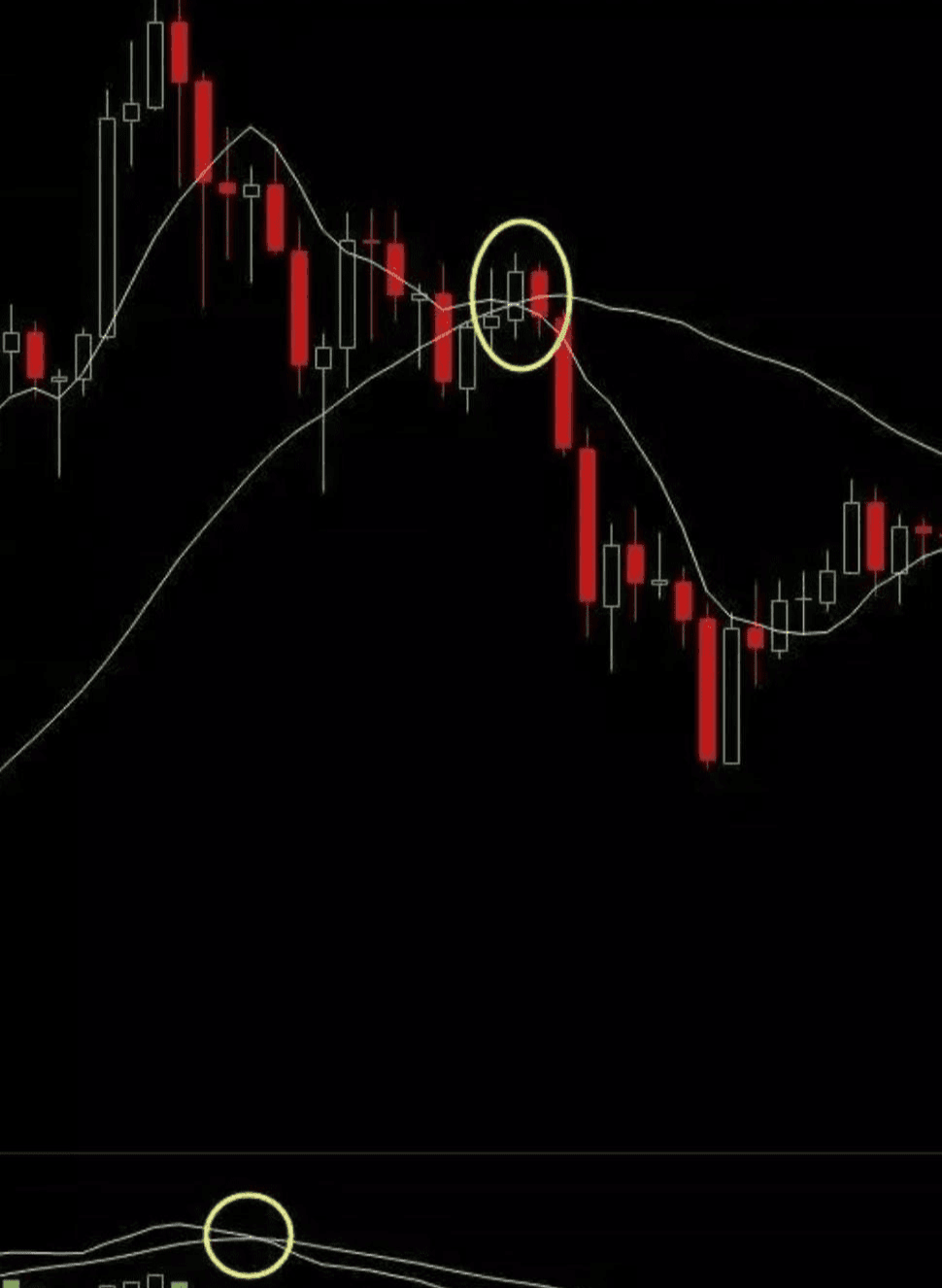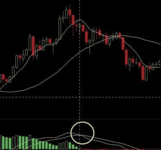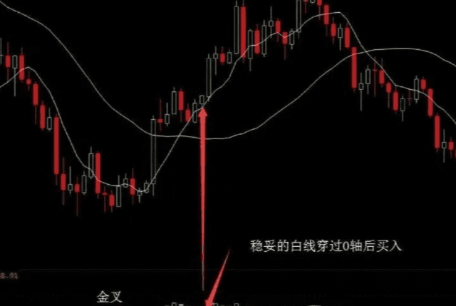 The fast line crosses the slow line from above, meaning the white line crosses the yellow line from below. Similarly, above the zero line, this is a sell signal for short selling and a pullback signal.