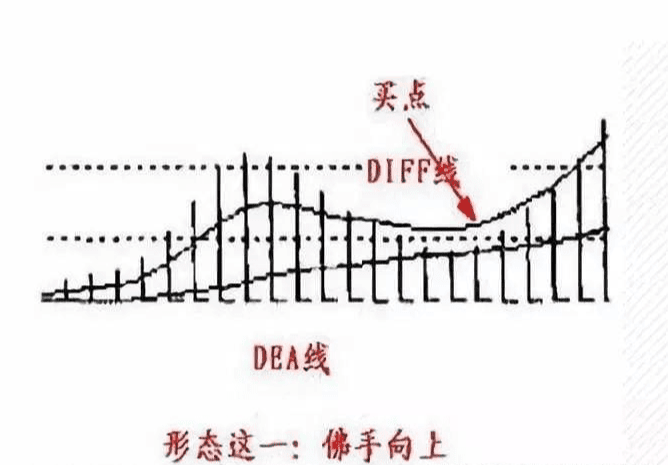 As shown in the chart below, after the DIF and DEA lines form a golden cross, they move upwards along with the price. Then, they move downwards along with the price pullback. When the main players are shaking out weak hands, the price pulls back, and when the DIF line pulls back to near the MACD line, the DIF line reverses upwards, thus forming the "Buddha's Hand Upward" pattern.