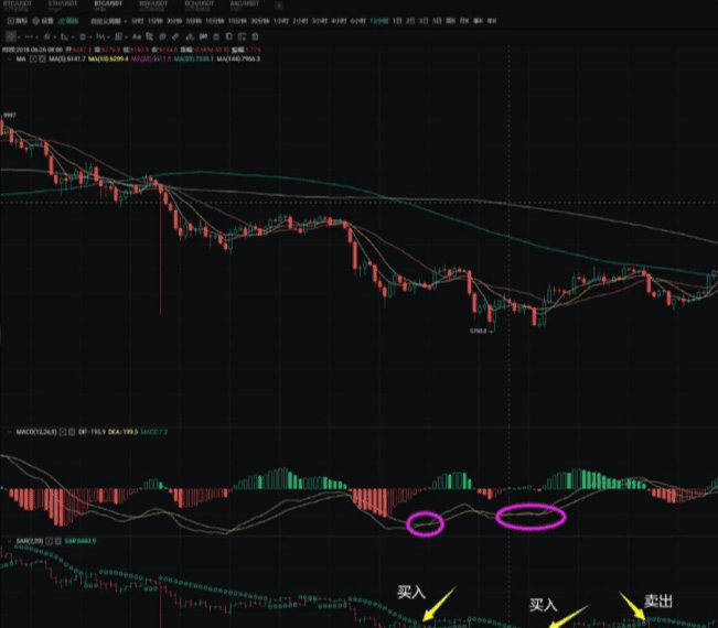 2. When the price breaks below the SAR curve and continues to move downwards while the SAR curve also moves downwards, it indicates that a strong downtrend has formed. The SAR curve exerts significant pressure on the price, and investors should resolutely hold cash and reduce positions on rallies. Based on my observation, this indicator is more suitable for 12-hour trading.
