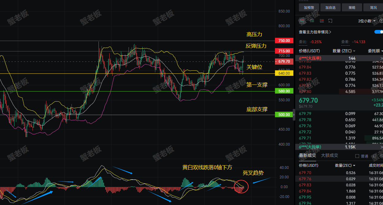After confirming the loss of the key level at 640, ZEC has officially entered a bearish pattern. The MACD yellow and white lines not only crossed below the 0 axis to form a death cross, but also exhibited a 'waterfall' divergence pattern, which is a classic signal for accelerated decline.