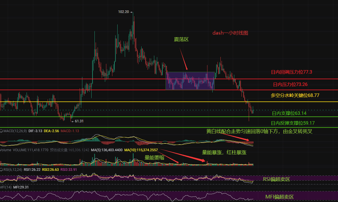 Looking at the hourly chart, Dash is struggling at the 68.77 bullish-bearish watershed, MACD has a death cross downwards, and both RSI and MFI are oversold, indicating heavy selling pressure! Support at 63.14 is a life-and-death line; if it breaks, it may slide to 63.13. The shrinking volume is a hidden danger, but after a sharp drop, there is often a rebound. The technical analysis tells us: now is not the time to blindly catch the bottom; we need to wait for signals!
