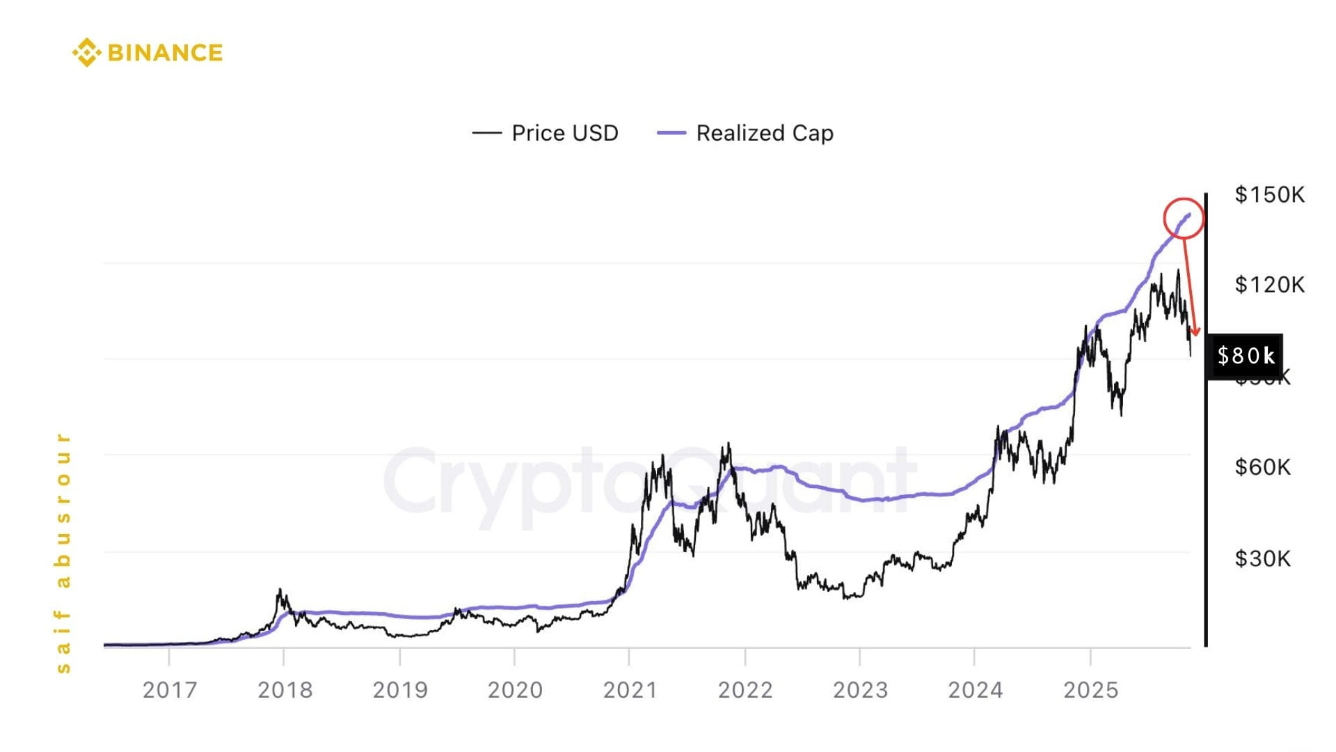 If the 2025 cycle had fully ended, it would be natural to see the purple value line slow down and flatten and perhaps even tilt downwards, as new money stops entering, and realized losses on-chain become greater than the capital being pumped in by new hands. This was clearly the case at the end of 2017 and then in 2021; the price crashed and with it, the realized value entered a long 'flat' phase. In the current chart, the opposite is happening: despite the drop from 126 to 82 thousand, the value curve is still in a strong upward trend, as if it is raising the overall cost floor of the market to a new level. This means that the current correction is more like a redistribution of Bitcoin from weak hands to stronger hands, not a collective exit of capital as seen at the end of classical cycles.