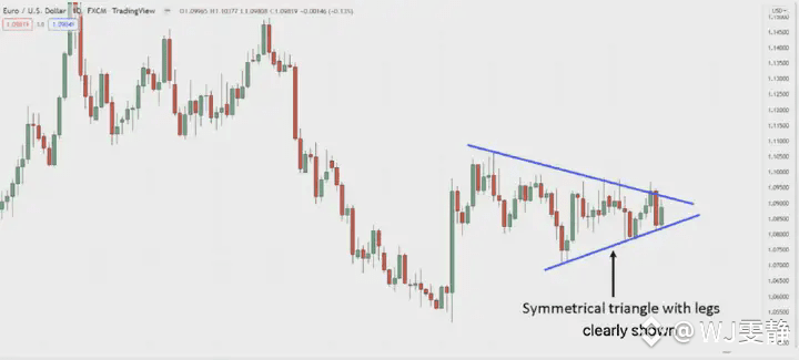 在观察对称三角形时,您将能够辨识出图案中的波动以及所谓的“摆动”和“腿”,正如我们在当前示例中所展示的那样,如下图所示。