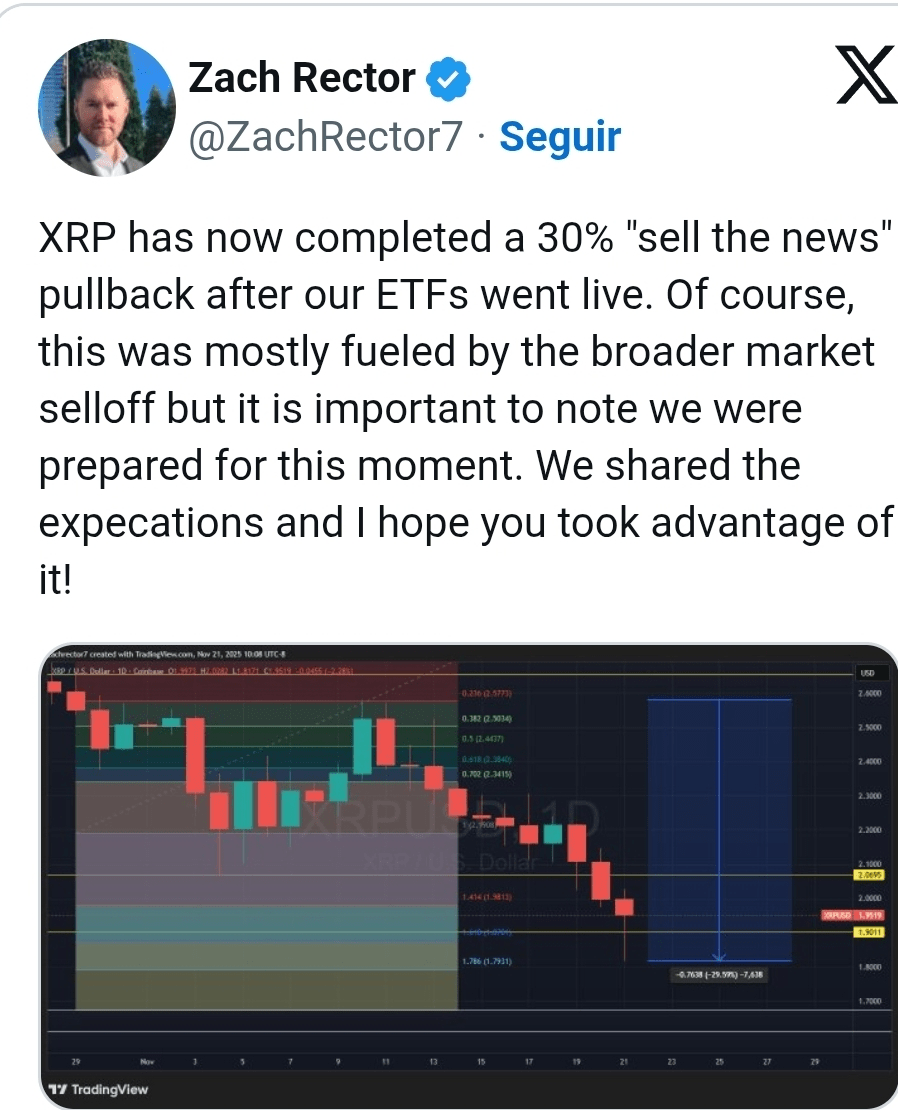 Rector stated that XRP completed a decline of approximately 30%, surpassing the previously reported 20% drop since the launch of the ETFs. He noted that most of the movement was driven by the market but emphasized that the correction fit into the framework he had previously outlined. His focus was on preparation, suggesting that those who followed his analysis should not be surprised by the current price movements.