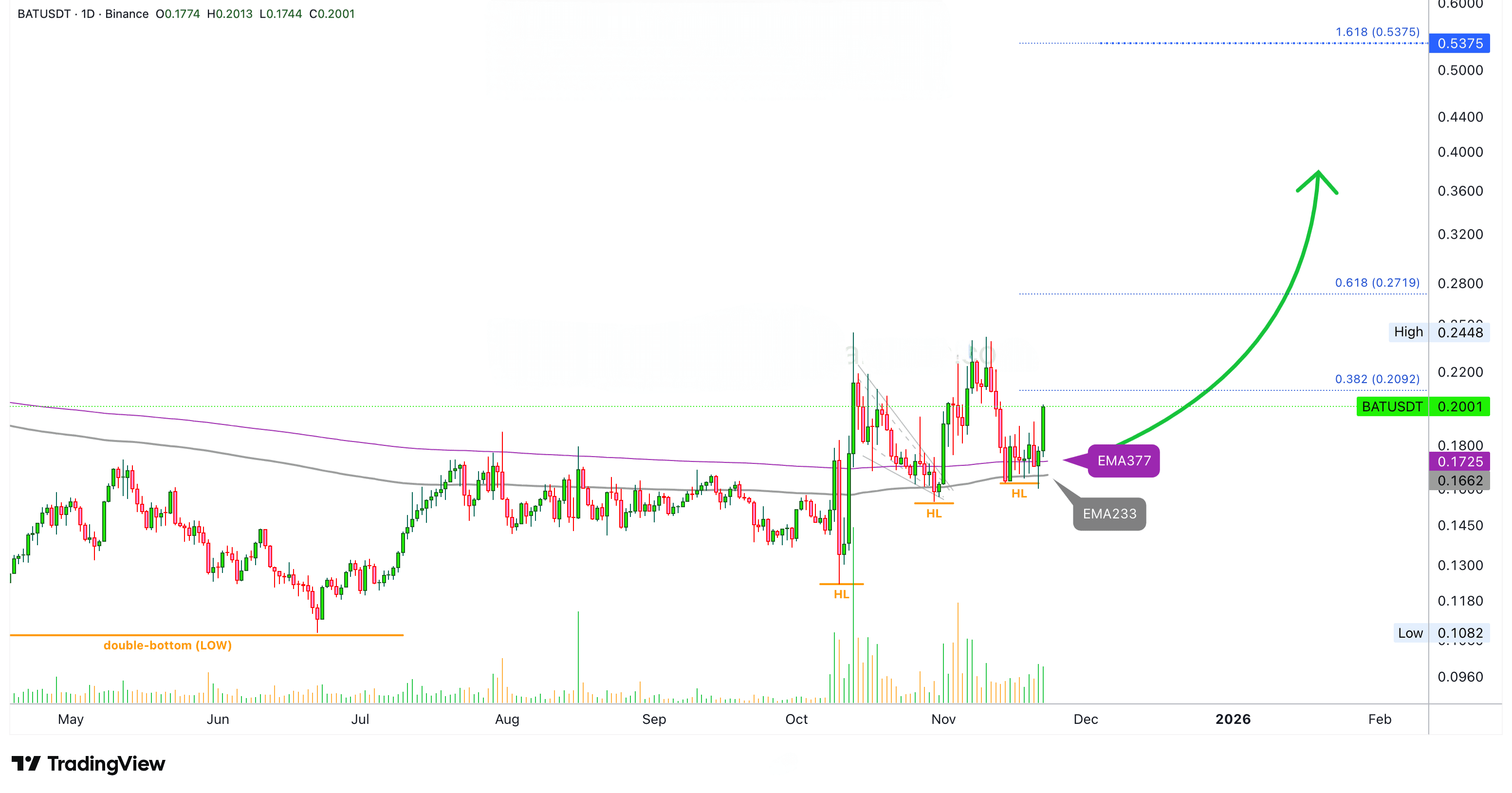 Here we see BATUSDT today with a full green candle above EMA377 and EMA233. We had a session yesterday with a long lower wick ending in green and also several higher lows. All of this is coupled with a very strong bullish trading volume day on October 13. All these signals combine support and affirm additional growth.
