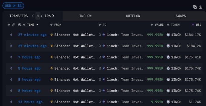 The 1inch team wallet withdrew about 6.01 million 1INCH from Binance in the past several hours, once again 'supporting the floor'; however, based on historical experience, team withdrawals may indicate a long-term bullish outlook or be for other purposes. A single action is difficult to directly infer pricing conclusions and is more suitable as a sentiment reference.