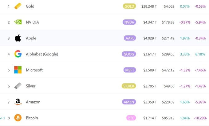 Bitcoin's total market value has returned to the 8th position among global assets, with prices still oscillating at high levels. Off-market sentiment has shifted from panic to cautious optimism, more of an expectation of 'after a big drop, will there be a wave of recovery' rather than a confirmed new round of a major bull market.