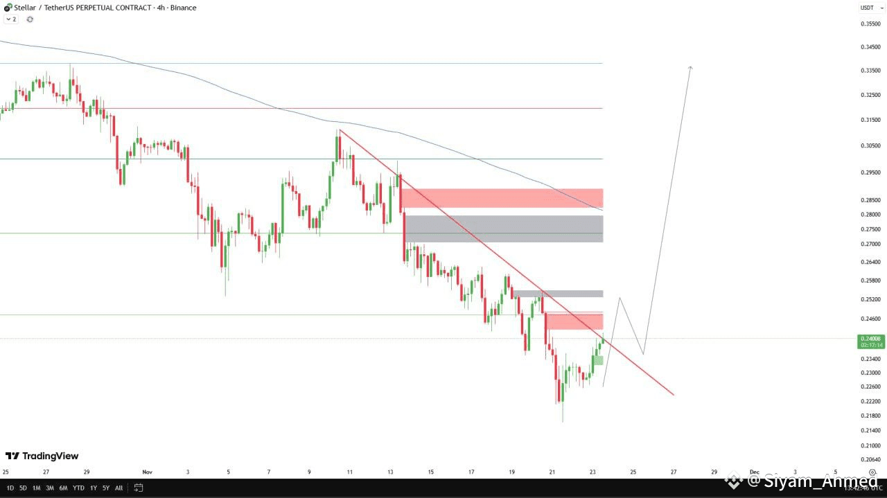 $XLM is approaching a crucial descending trendline on the 4H timeframe. If buyers manage to break above this level, it could signal the beginning of a short-term uptrend.