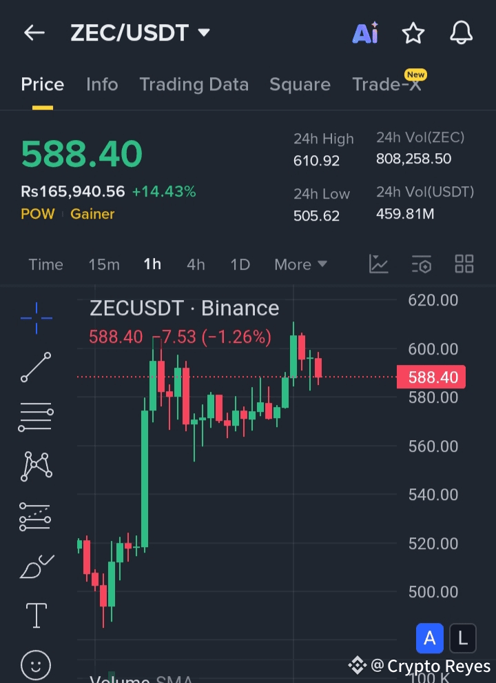 $ZEC Bounced from 505.62 → now 588.40, charging toward the 610+ zone. Buyers are stepping in and momentum is heating up — this one could run fast! 👀🚀