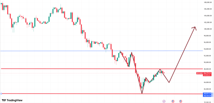 After the big pancake touched 80600 at the low point a few days ago, it has been three days of rebound at the daily level. The four-hour rhythm is still quite good. The main reason for this wave of increase is mainly to avoid the linkage with the U.S. stock market opening. The market has rebounded from the bottom, and the current high point has rebounded to 88000. In the short term, the rebound from the bottom is basically at this position. To continue to push above 93000, it still needs favorable news or real capital inflows to drive the next phase of the rebound. I believe the market needs to pull back to the range of 83000-84000 to truly have a significant rebound. The short-term rebound and decline are more due to the clearing of leverage, so be cautious with leverage when bottom-fishing. If there is a chance to pull back, you could start considering building positions in batches. If it goes up directly without a pullback, I do not recommend chasing highs; continue to wait for opportunities.