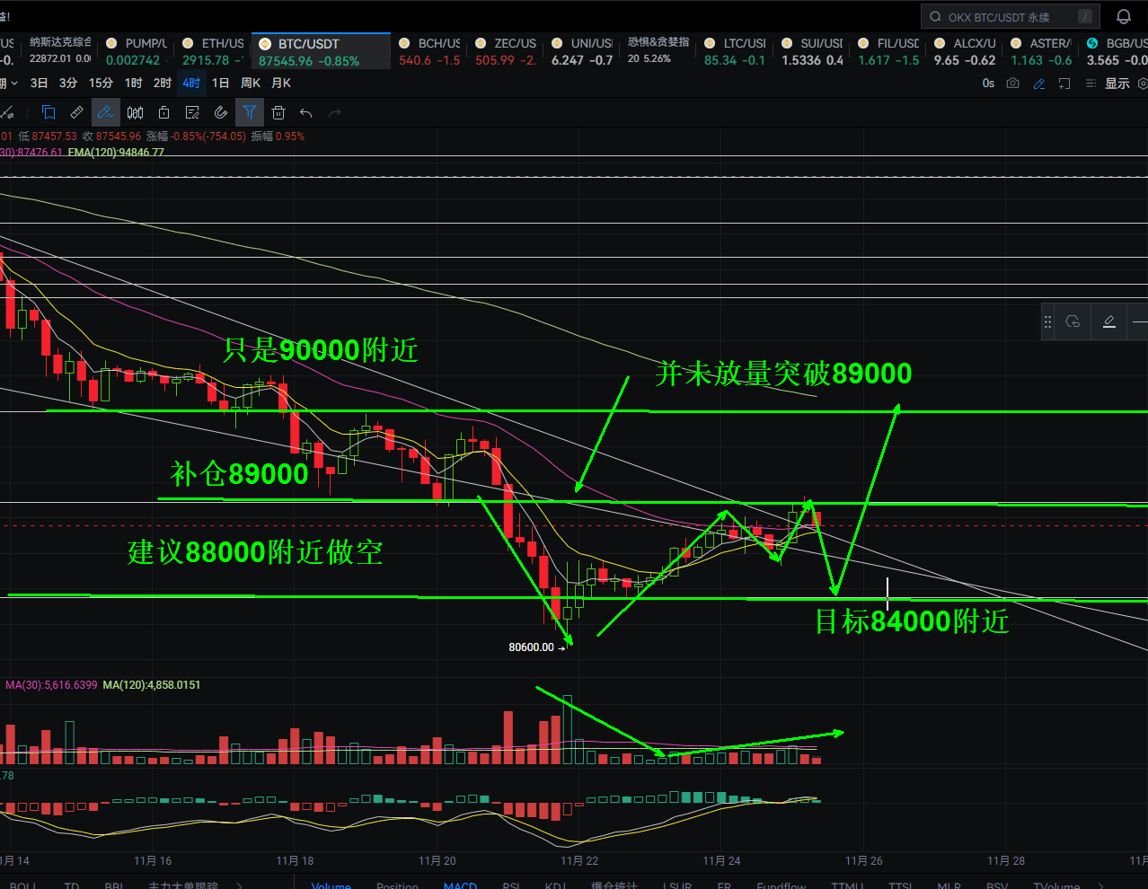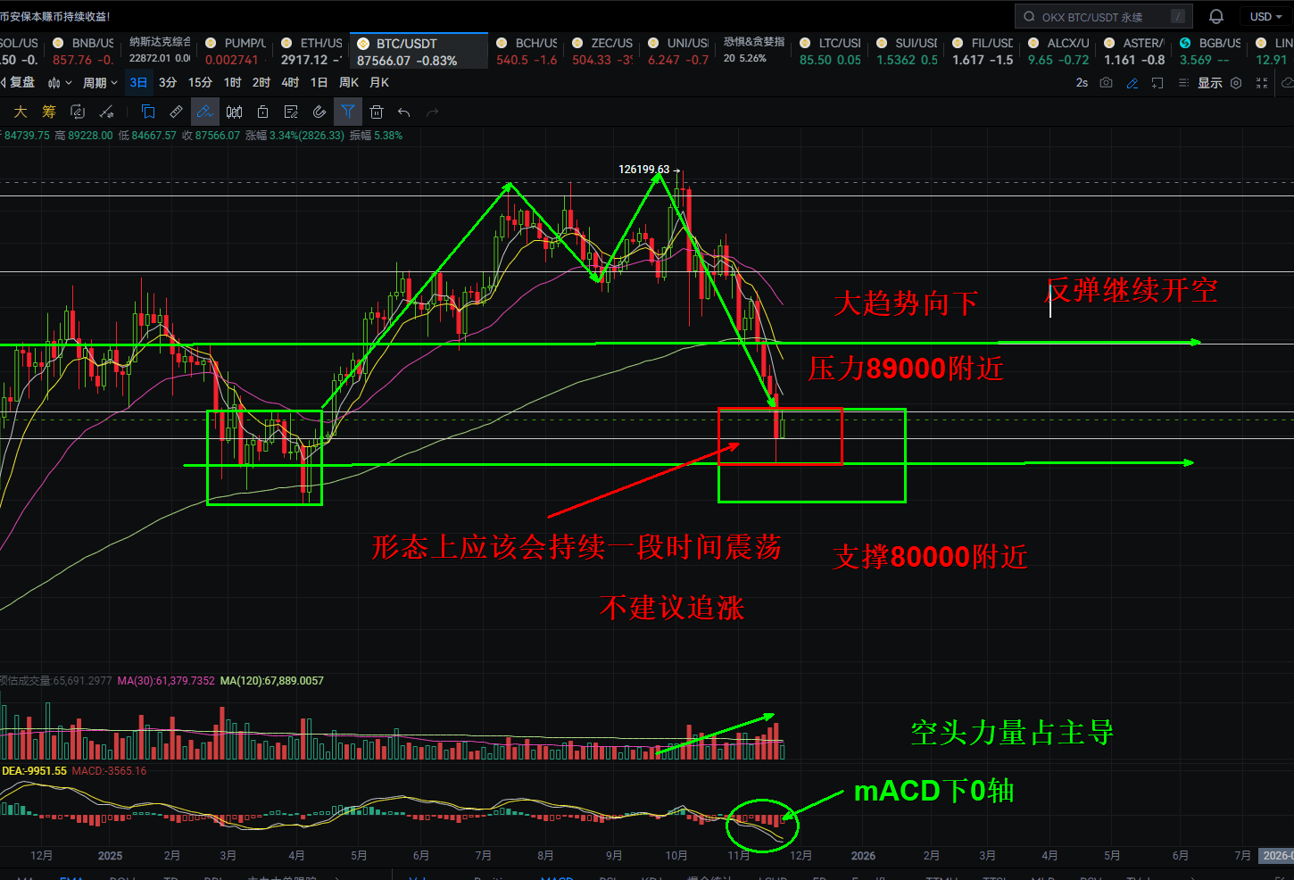 The 3-day line pattern shows that the overall trend is downward, and the rebound can continue to open shorts. The pattern needs to oscillate for a while. Long around 80000 on the pullback, short around 89000 on the rebound, just ensure to set a stop loss.