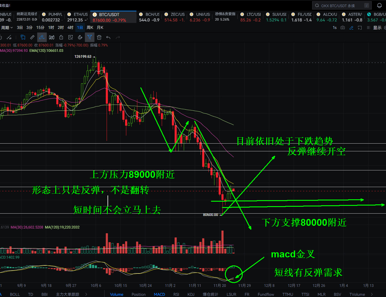 Currently, from the daily level pattern, BTC is rebounding from the bottom, with a MACD golden cross, and the K-line bottom is rising. There is a demand for a short-term rebound, and it is unlikely to break below 80,000 in the near future. The pattern is still in a downtrend, and the rebound continues to open shorts. It is just a rebound, not a reversal. It won't shoot up immediately. The upper pressure is around 89000.