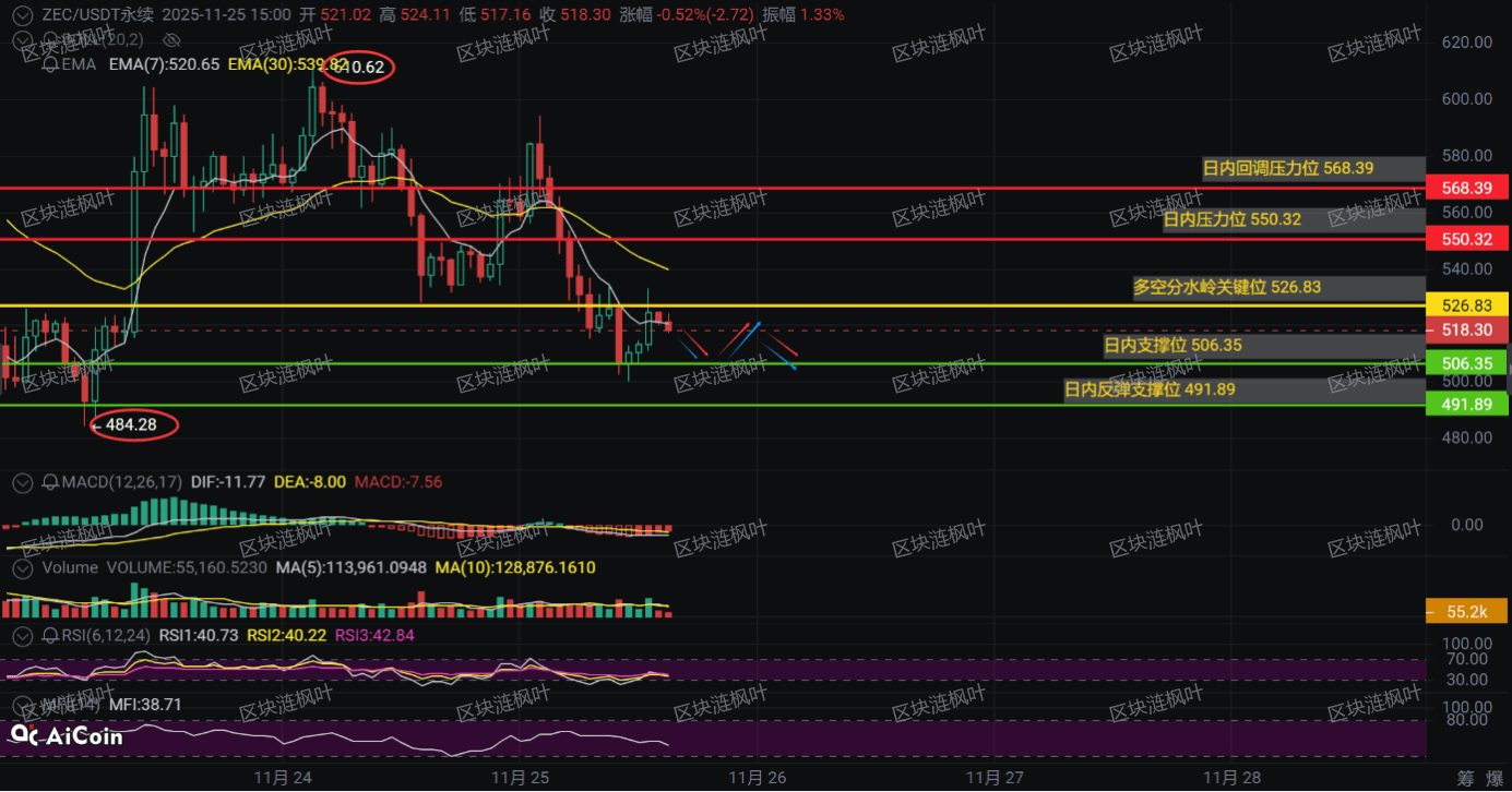 Counterintuitive logic: The price falling from 524 to 518 seems resilient, but in fact, it is a false appearance created by the market makers! The whale's switch to MON exposes the truth: small coins sucking blood leads to mainstream coins losing blood, ZEC passively follows the decline!