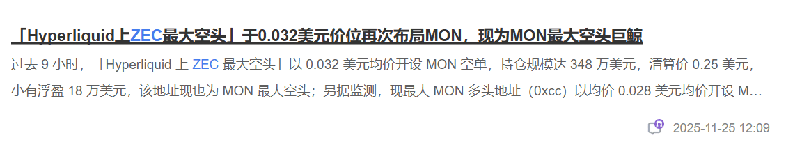 Midnight thunder! Hyperliquid whales suddenly turn their guns — the top player who once heavily shorted ZEC is unexpectedly smashing MON shorts at 0.032! What signal is this batch of funds releasing? While the market is still entangled in ZEC's 526 watershed, the whales have already voted with their feet: the liquidity trap of small coins is fermenting, and mainstream coins may become the next prey! Today, Maple Leaf will help you tear apart the surface and seize the money-making opportunities amidst the plunge!