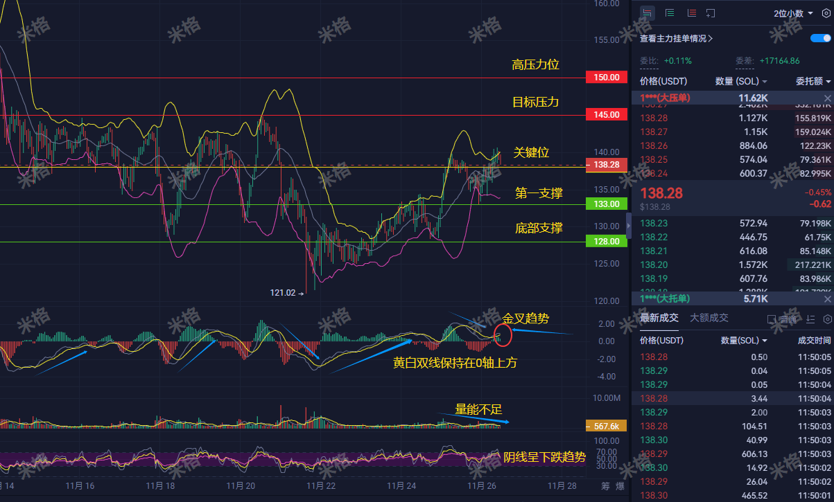 From the technical chart perspective, SOL is currently in a clear upward trend, with key support near $138, and resistance levels at $145 and $150. The MACD indicator shows that the yellow and white lines remain above the 0 axis, forming a golden cross signal, indicating strong buying momentum.