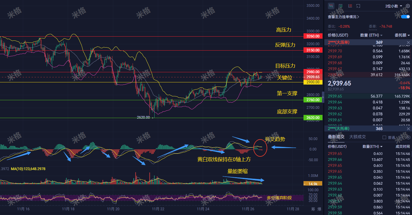 The chart shows that ETH has strong support at the key level of 2900. Although the MACD shows a death cross, it remains above the zero line, which is a typical signal of bullish consolidation.