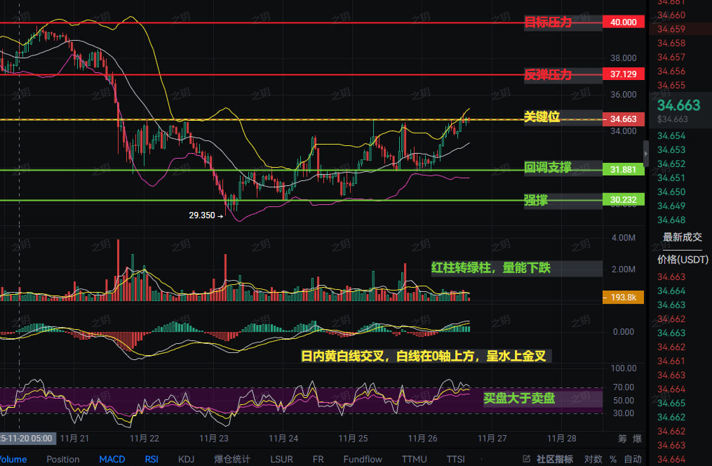 Now, all our eyes should be firmly focused on the two key resistance levels I drew in the second chart: $37.129 and $40.000. I can clearly tell everyone my viewpoint: without major positive news to drive it, the market's first attempt to hit these two positions is likely to fail and pull back. Why? Because too many people who chased high are trapped there; once the price approaches, they will rush to sell and release the pressure. So, if you want to chase high now, I advise you to calm down first.