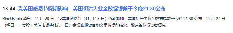 Due to the impact of the US Thanksgiving holiday, initial unemployment claims data will be released tonight at 21:30, and this unexpected change may disrupt market balance.